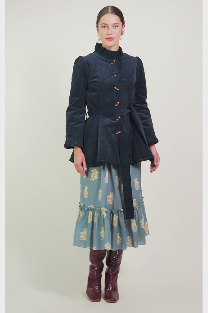 - Deep welt pockets, wooden toggle closure, dramatic peplum styling